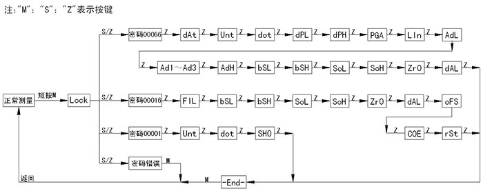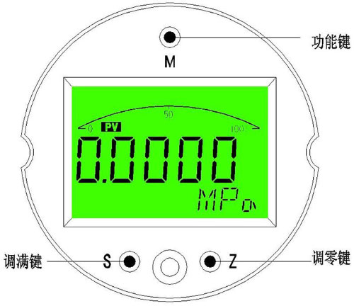 4.2.2調(diào)滿鍵“S” ?測(cè)量模式下短按為顯示模式修改功能。 ?測(cè)量模式下長(zhǎng)按5秒為進(jìn)入調(diào)滿功能(即標(biāo)定變送器滿點(diǎn))。 ?設(shè)置模式下為設(shè)置參數(shù)加一功能,長(zhǎng)按時(shí)連續(xù)移位加一。 4.2.3調(diào)零鍵“Z” ?測(cè)量模式下短按為顯示模式修改功能。 ?測(cè)量模式下長(zhǎng)按5秒為進(jìn)入調(diào)零功能(即標(biāo)定變送器零點(diǎn))。 ?設(shè)置模式下為設(shè)置參數(shù)移位與減一功能,長(zhǎng)按時(shí)連續(xù)移位或減一。 4.2.4按鍵功能綜述 儀表通過(guò)面板的三個(gè)按鍵實(shí)現(xiàn)所有的參數(shù)輸入和校準(zhǔn)數(shù)據(jù)的設(shè)置、采集,本儀表的設(shè)置和輸入采取了多種優(yōu)化措施來(lái)提高客戶的操作速度: ?儀表的移位鍵和增加鍵具有變速率功能。 ?儀表同時(shí)具有移位和增量輸入方法,針對(duì)需要大量數(shù)修改的菜單使用移位方式,需要連續(xù)輸入數(shù)據(jù)的菜單采取了增量方式。 ?儀表在設(shè)置狀態(tài)下會(huì)停止模擬輸出,所以如果60秒內(nèi)用戶沒(méi)有操作儀表,則會(huì)自動(dòng)退出到測(cè)量狀態(tài)。 ?儀表在正常退出菜單的時(shí)候才會(huì)保存所有設(shè)置的參數(shù)。 4.3快捷功能 ?儀表有主變量清零,零點(diǎn)有源遷移,滿點(diǎn)有源遷移三種快捷功能,便于用戶現(xiàn)場(chǎng)的快速設(shè)定。 4.3.1主變量清零 主變量清零即PV清零,是相對(duì)大氣壓下的零點(diǎn),不是傳感器量程的零點(diǎn)。將變送器直接置于大氣壓下,長(zhǎng)按“M”鍵5秒以上,即可進(jìn)入主變量清零功能,如右圖,菜單區(qū)顯示“P=0”,通過(guò)“S”鍵和“Z”鍵選擇需要進(jìn)行的操作,提示符區(qū)相應(yīng)顯示: