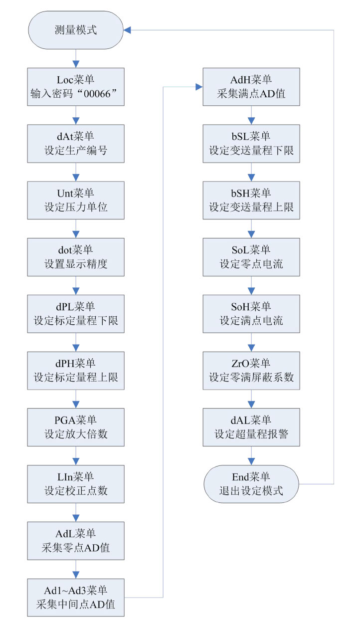 4.5菜單說(shuō)明 本儀表菜單分為“生產(chǎn)調(diào)試菜單”; “高級(jí)用戶菜單”;“普通用戶菜單”三級(jí),由各級(jí)菜單的進(jìn)入密碼做為區(qū)分。 ?“生產(chǎn)調(diào)試菜單” 進(jìn)入密碼為“00066”,由變送器生產(chǎn)廠家使用,對(duì)變送器的基本參數(shù)進(jìn)行設(shè)置,決定了變送器的精度,標(biāo)定值等參數(shù),因此生產(chǎn)調(diào)試菜單不能對(duì)一般用戶開放,以免標(biāo)定數(shù)據(jù)被破壞。 ?“高級(jí)用戶菜單” 進(jìn)入密碼為“00016”,是針對(duì)變送器現(xiàn)場(chǎng)使用要求進(jìn)行一些特殊設(shè)置時(shí)使用。 ?“普通用戶菜單” 進(jìn)入密碼為“00001”,可進(jìn)行顯示單位,顯示分辨率,以及顯示模式的設(shè)定。 注:在高級(jí)用戶與用戶菜單設(shè)定時(shí),若60秒內(nèi)無(wú)任何按鍵操作,將自動(dòng)退出設(shè)定并返回到測(cè)量模式。 4.5.1密碼設(shè)定菜單 Loc: 密碼輸入菜單,可設(shè)范圍(19999~99999),菜單提示符“PIN” 設(shè)定菜單進(jìn)入密碼,若輸入密碼錯(cuò)誤或30秒內(nèi)無(wú)任何按鍵操作,將自動(dòng)返回測(cè)量模式。 4.5.2普通用戶菜單 Unt: 用戶單位設(shè)置,可設(shè)范圍(0~18),菜單提示符為設(shè)定的各個(gè)單位 單位設(shè)定共有19種,分別為“MPa”,“KPa”,“Pa”,“bar”,“mbar”, “PSI”, “mH2O”, “mmH2O”, “InH2O”, “ftH2O”, “mHg”,“mmHg”, “InHg”,“Kg/cm2”,“atm”,“Torr”,“m”,“cm”,“mm” dot: 顯示精度設(shè)置,可設(shè)范圍(0~4),菜單提示符為當(dāng)前壓力單位 顯示分辨率即測(cè)量模式時(shí)顯示的小數(shù)位數(shù),用戶可根據(jù)現(xiàn)場(chǎng)使用要求對(duì)其設(shè)定,顯示小數(shù)位數(shù)并非越多越好,應(yīng)優(yōu)先保證顯示值的穩(wěn)定。同時(shí)此菜單值會(huì)受到標(biāo)定時(shí)變送器最大顯示值的限制,若設(shè)定的小數(shù)點(diǎn)顯示位數(shù)在顯示變送器最大顯示值時(shí)超出5位顯示范圍時(shí),則設(shè)定的小數(shù)位數(shù)會(huì)被限制在保證最大顯示值能被正常顯示的范圍內(nèi)。 例如:變送器標(biāo)定范圍為0.0000~20.000MPa;則顯示精度的設(shè)定范圍為(0~3),若顯示精度設(shè)定值為4時(shí),最大顯示值將超出最大5位的顯示范圍 SHO: 顯示模式設(shè)定,可設(shè)范圍(0~5) “0”--顯示主變量,提示符“-PV-” “1”--顯示電流, 提示符“-mA-” “2”--顯示百分比,提示符“-%-” “3”--主變量與電流交替顯示, 提示符“PV-mA” “4”--主變量與百分比交替顯示,提示符“PV--%” “5”--電流與百分比交替顯示, 提示符“mA--%” 4.5.3高級(jí)用戶菜單 FIL: 濾波常數(shù)設(shè)定,可設(shè)范圍(0~2) “0”—濾波低,提示符“LOW” “1”--濾波中,提示符“MId” “2”--濾波高,提示符“HIg” 濾波常數(shù)值設(shè)定越大,對(duì)干擾的抑制能力越強(qiáng),但靈敏度會(huì)下降,生產(chǎn)標(biāo)定時(shí)本菜單值默認(rèn)值為“1”為中等濾波效果,能適應(yīng)大多數(shù)的應(yīng)用場(chǎng)合。 bSL: 變送量程下限設(shè)定,可設(shè)范圍(-19999~99999),菜單提示符顯示當(dāng)前壓力單位。 此功能可實(shí)現(xiàn)變送輸出的零點(diǎn)無(wú)源遷移,其設(shè)定的壓力值將對(duì)應(yīng)到“SoL”零點(diǎn)電流菜單設(shè)定電流值,為了方便用戶設(shè)定,此菜單中的小數(shù)點(diǎn)位置可通過(guò)按鍵進(jìn)行設(shè)定,以便用戶能快速設(shè)定需要的數(shù)值。 變送器的變送最小量程可按傳感器量程的3:1進(jìn)行壓縮,最大量程可按傳感器量程的1:1進(jìn)行設(shè)置,超出此范圍將影響變送輸出精度。 bSH: 變送量程上限設(shè)定,可設(shè)范圍(-19999~99999),菜單提示符顯示當(dāng)前壓力單位。 此功能可實(shí)現(xiàn)變送輸出的滿點(diǎn)無(wú)源遷移,其設(shè)定的壓力值將對(duì)應(yīng)到“SoH”滿點(diǎn)電流菜單設(shè)定電流值,為了方便用戶設(shè)定,此菜單中的小數(shù)點(diǎn)位置可通過(guò)按鍵進(jìn)行設(shè)定,以便用戶能快速設(shè)定需要的數(shù)值。 變送器的變送最小量程可按傳感器量程的3:1進(jìn)行壓縮,最大量程可按傳感器量程的1:1進(jìn)行設(shè)置。超出此范圍將影響變送輸出精度。 SoL: 零點(diǎn)電流微調(diào),可設(shè)范圍(-150~200) 設(shè)定此菜單時(shí),儀表將交替顯示工廠設(shè)定的零點(diǎn)電流值與零點(diǎn)電流D/A微調(diào)值,同時(shí)變送器輸出設(shè)定的電流值,當(dāng)顯示設(shè)定的零點(diǎn)輸出電流值時(shí)菜單提示符顯示“L-OUT,顯示零點(diǎn)電流D/A微調(diào)值時(shí)菜單提示符顯示“L-D/A”,變送器使用過(guò)程中若輸出的零點(diǎn)電流值存在誤差時(shí),可在變送器電源回路中串接電流表,通過(guò)“S”和“Z”對(duì)零點(diǎn)電流值進(jìn)行微調(diào),電流微調(diào)范圍約±0.2mA 。 SoH: 滿點(diǎn)電流微調(diào),可設(shè)范圍(-150~200) 設(shè)定此菜單時(shí),儀表將交替顯示工廠設(shè)定的滿點(diǎn)電流值與滿點(diǎn)電流D/A微調(diào)值,同時(shí)變送器輸出設(shè)定的電流值,當(dāng)顯示設(shè)定的滿點(diǎn)輸出電流值時(shí)菜單提示符顯示“H-OUT”,顯示滿點(diǎn)電流D/A微調(diào)值時(shí)菜單提示符顯示“H-D/A”,變送器使用過(guò)程中若輸出的滿點(diǎn)電流值存在誤