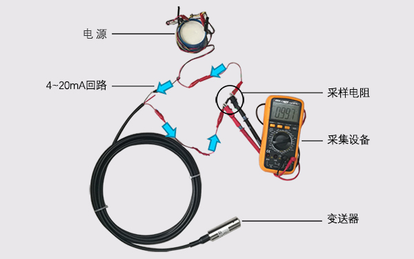 下圖為實(shí)際應(yīng)用模擬圖,藍(lán)色箭頭所指為4~20mA電流流向,使用萬(wàn)用表作為采集設(shè)備,采樣電阻250歐,零點(diǎn)電流4mA,采集到的電壓約0.997V(0.004mA×250歐=1V)。